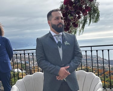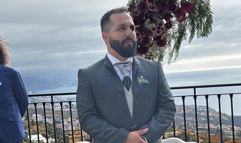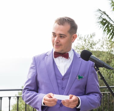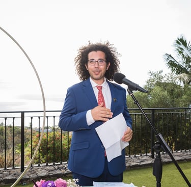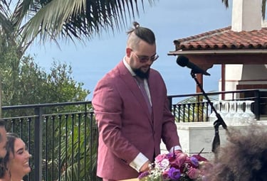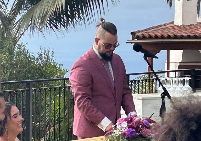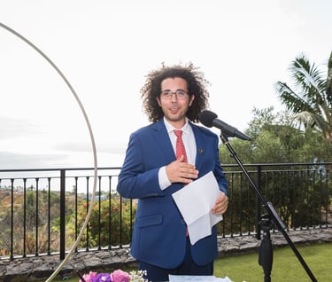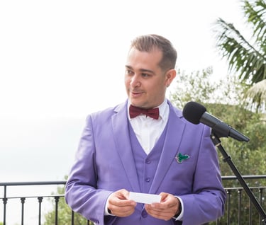Se nota cuando una persona hace las cosas con el corazón. La ceremonia ha sido sencillamente increíble gracias a este señor. Salió a escena con "I'm still standing" de Elton John y se ganó a los invitados desde el principio. Presentó a los padrinos y a las damas de honor, también a los novios, y ahí comenzó la magia. Un bonito discurso como amigo, una estructura de ceremonia simplemente impecable y acabando con "The Return of the King" a capella.